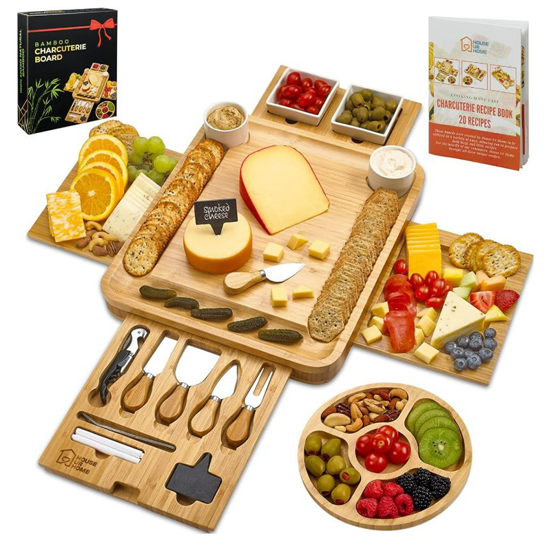 Elevate your hosting experience with this versatile charcuterie board set with features such as grooves for crackers, removable ceramic bowls, and four hidden drawers with labeled utensils all elegantly presented. Its multifunctional design makes it a perfect companion for any gathering, adding both style and convenience to your hosting endeavors, including open houses.